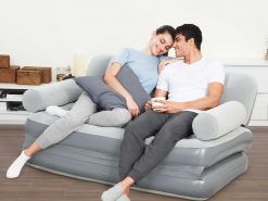 Este sofá hinchable puede usarse como sofá o como cama. Es fácil de transportar y se hincha en tan solo unos minutos con la bomba de CA Sidewinder™ incluida para que pueda empezar a relajarse de inmediato. Cuando está en la posición de sofá, dispone de cómodos reposabrazos y respaldos, que pueden reclinarse mientras ve una película o juega a la consola. Los asientos del sofá se extraen para formar el colchón, que puede usarse como cama. El colchón es casi de matrimonio y caben 2 personas cómodamente. La superficie del sofá es aterciopelada, lo que le confiere una textura suave y acogedora. Perfecto como accesorio de viaje, como cama extra en casa o como asiento en la sala de juegos, ¡disfruta de la comodidad que ofrece el sofá hinchable Multi-Max!